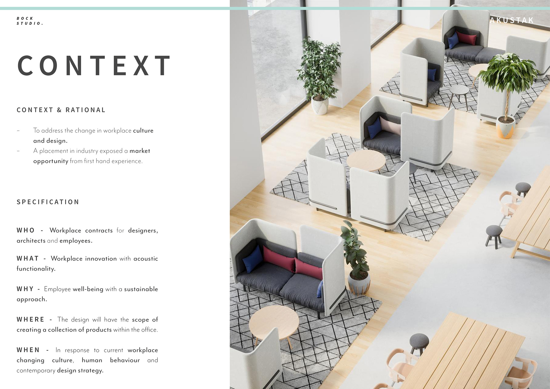 The first documented Akustak (major project) reflecting upon the design process and approach with key milestones along the way reflecting on the decisions made throughout. Below you can find an example spread of the 30 page document. The second document reflects upon my placement and some of the projects carried out during my time at the company.